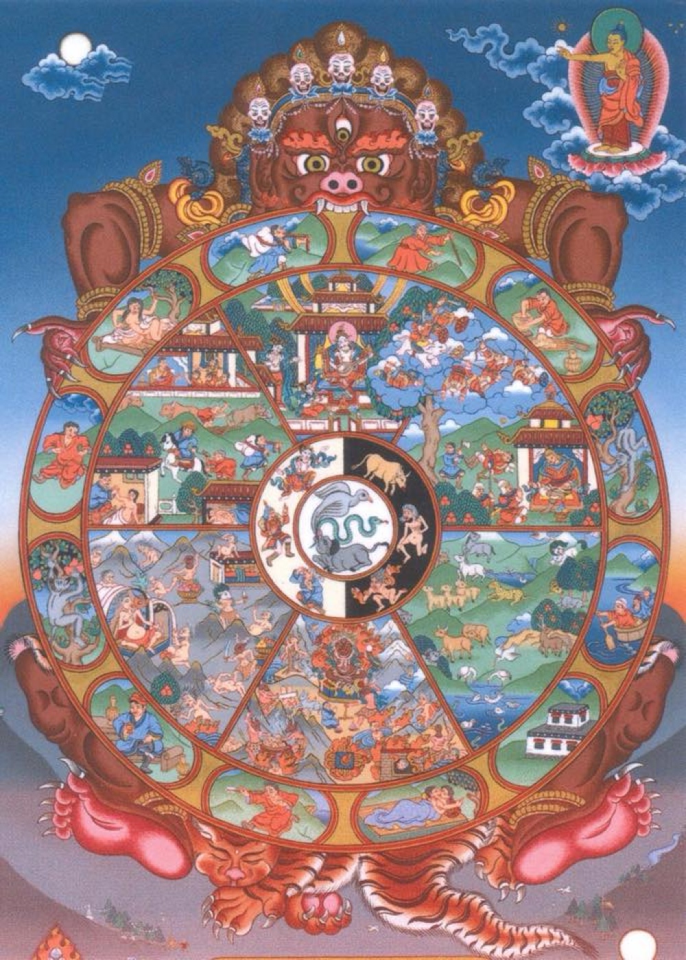 この絵は、仏陀が説いた四つの聖なる真理と十二の縁起の教えに基づき、人々がどのように輪廻に縛られているかを示した、図による教えです。輪廻の輪は五層から成り立っています。輪を円形に描いているのは、輪廻に始まりも終わりもないことを表しています。